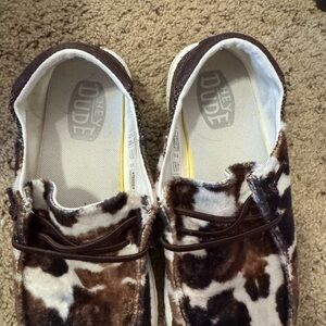 Hey Dude Brown and White Cow Patterned Shoes 9