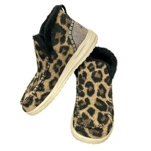 Hey Dude Denny Beige Leopard Animal Print Fur Ankle Bootie 6 Lightweight Comfy