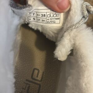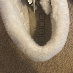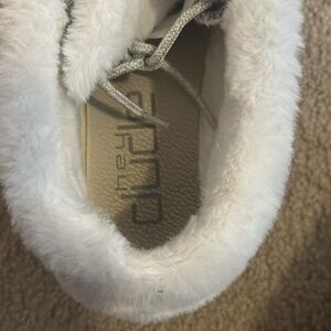 Comfortable gray shoes with soft white fur lining. Perfect for cozy wear.