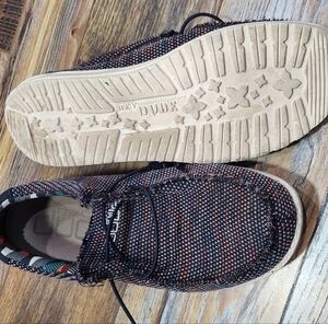 Step into comfort with Hey Dude men's casual shoes. Featuring a stylish blue, multi colored design, these shoes offer both style and comfort for everyday wear. Gently used condition. Men size 10.