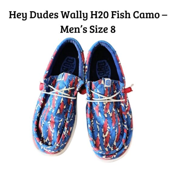 Comfortable, lightweight Hey Dude men’s slip-on shoes in the popular Fish Camo pattern. Easy everyday casual shoes with a cushioned feel and relaxed fit — perfect for errands, travel, or laid-back wear.