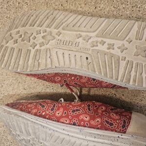 Stylish red paisley loafers by Hey Dude. Comfortable and perfect for casual wear.