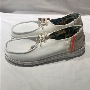Comfortable white shoes with a natural design. Features a unique lace style and soft fabric.
