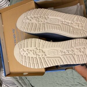 Stylish navy slip-ons by Hey Dude. Features a patterned lining and lace detail.