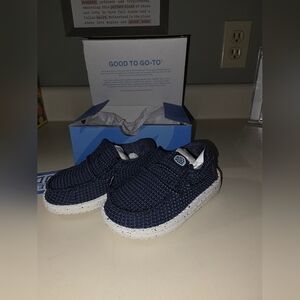 Stylish navy blue toddler shoes by Hey Dude. Comfortable and lightweight design.