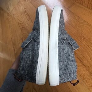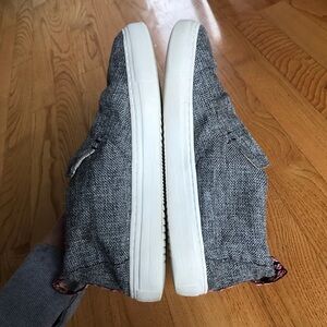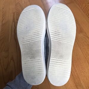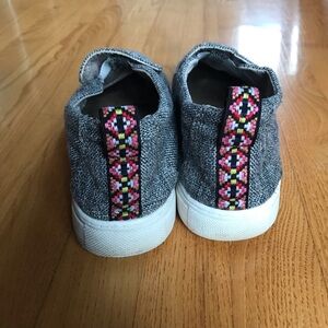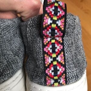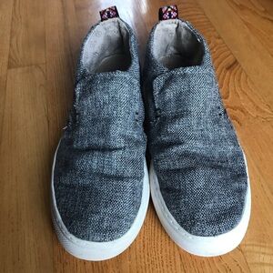 HD Peyton shoes in linen grey black with white rubber soles. Cute Aztec type fabric detailing on the backs of them. Removable insoles. They are in good used condition and do show considerable wear to the soles and some fabric wear on the inside back of the left shoe. Hasn’t affected functionality for me when wearing them. Womens US size 9.
