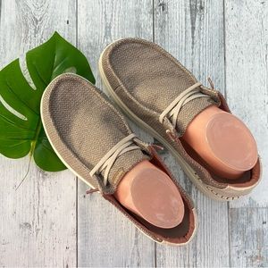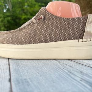 Tan &Beige, platform, gold metallic and tweed Hey Dude shoes in very good condition.