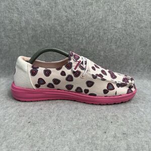 Hey Dude Shoes Youth 4 Wendy White Pink Slip On Heart Print Comfort Shoes New