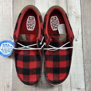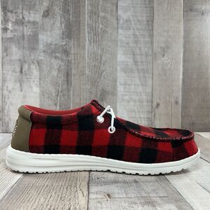 Hey Dude Wally Youth Size 2 Buffalo Plaid Slip On Loafer Sneaker Shoes Red Black