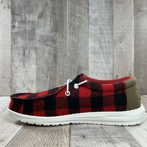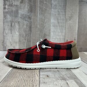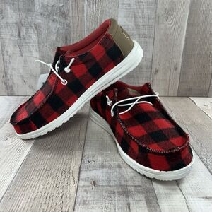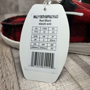 Hey Dude Wally Youth Size 2 Buffalo Plaid Slip-On Loafer Sneaker Shoes Red Black