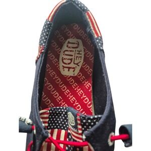 Keywords: Hey Dude, Wendy Fun America, Women's shoes, Loafers, Slip on shoes, Patriotic, American flag, Comfortable shoes, Casual shoes, Summer shoes, Size 8, Red white and blue, Stars and stripes, USA, Fourth of July