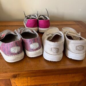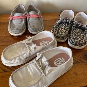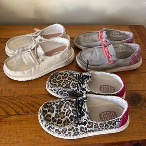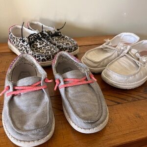 Gray with pink shoe strings are a size 12. The gold and leopard print are a size 13. All three are a toddler/kids shoe. Worn with visible signs of wear please see photos. Pet & smoke free home.