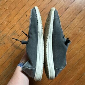 Hey Dude comfortable, off black/gray, slip on, basic, versatile shoes. Minor wear on the insoles, but overall in good condition. Great, washable shoes. From a pet and smoke free house.
