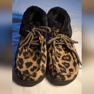 These shoes feature a striking leopard print design on the front, complemented by a soft, fuzzy black material around the ankle. The flat sole ensures comfort, making them perfect for casual wear.