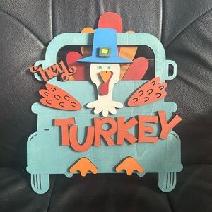Charming fall decor with a turkey design. Features vibrant orange and blue colors. Ready to ship hanger included.