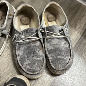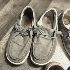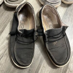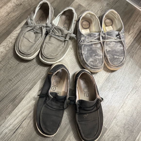 Three pairs of hey dude shoes. All have been well loved. A lot of life left in them. I just no longer wear them.
