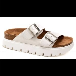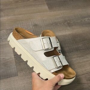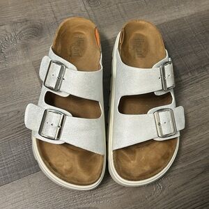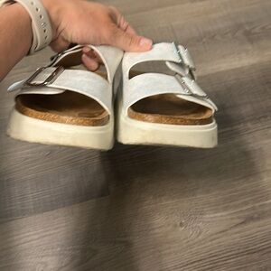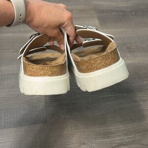 Stylish white sandals with double buckle design. Comfortable and trendy.