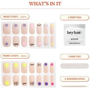Semi Cured Gel Nail Strips | No LED Lamp Needed | Spring, Marble, Pink | Easy Apply & Remove, Salon Quality | Includes 1 Prep Pads, Nail File & Wooden stick - Hey, You Make Me Smile Top highlights Color Hey, You Make Me Smile Size 1 Count (Pack of 1) Brand heyhae Style Solid, Abstract Design Pattern Abstract Item Form Strip Playful, bold, and full of personality—this set features a neon star, a smiley face, and fun doodles to add a touch of happiness to your fingertips. Surprise twist! This set includes two different color variations, letting you mix and match pastel hues for even more fun. Double the vibes, double the creativity! Enjoy a complete package of fresh salon quality nails done at ease everywhere and anywhere you go! Package includes: 28 strips, 1 Prep pad, 1 Nail file, & 1 Wooden stick. Simple Cure! NO LED Lamp needed! Sun-cured Gel Nails - Simply let it cure by itself under the sunlight (UV Index 3+). **Curing time under sunlight can vary depending on various factors such as weather conditions, environmental factors, and humidity levels. No natural sunlight? No worries. Cure it under UV/LED lamp just for 5 seconds! Fits all nail size and shapes - Use your palm to warm them up. Once the strips are warmed, they can be easily pulled for the perfect fit on your nails. Attach the nail strip along one side of the nail, and then stretch it to fit the other side of the nail. Vegan & Animal-Friendly - not tested on animals and does not include any harmful ingredients.