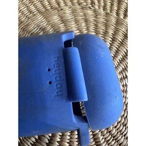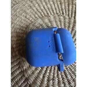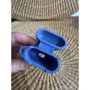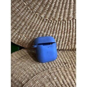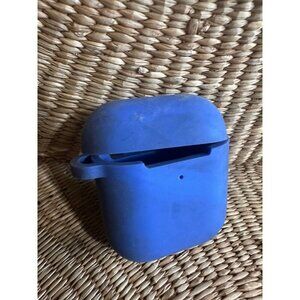 Protective silicone case for Apple AirPods by Heyday in a matte blue finish. Measures approximately 2.5” tall by 2.25” wide, with charging port access on the bottom and a hinged lid design. Light signs of wear.