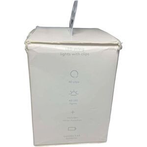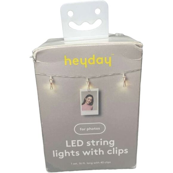 Heyday LED String Lights with Photo Clips Warm Glow 10 ft Battery Powered (3x AA). Create a cozy photo display for bedrooms, dorms, parties, weddings, holidays, and gifting. Explicit clips hold Instax/Polaroid photos, prints, cards, and artwork. Flexible placement: walls, windows, headboards, gallery grids. Easy on/off battery pack, no outlet needed. New item; outer box shows shelf wearcontents unused.