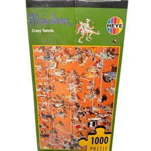 Rare and collectible Heye triangular box puzzle featuring Crazy Tennis by Blachon. This 1000-piece jigsaw puzzle is filled with humorous details in a busy tennis scene — classic Heye comic style.