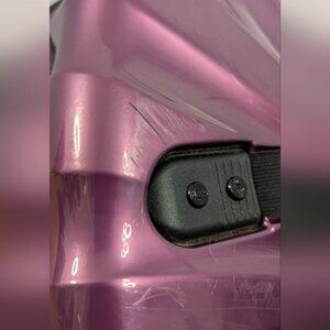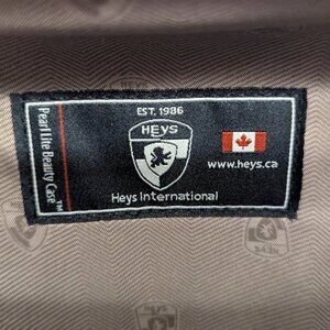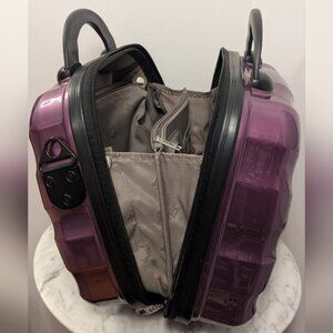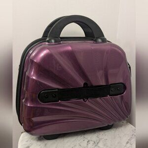 Elegant purple hard shell carry-on luggage by Heys. Features a sleek design and comfortable handle.