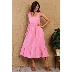 This dress is designed to make you stand out at any special occasion, from weddings to cocktail parties, with its stunning features and attention to detail. This dress showcases a timeless silhouette that flatters every body type. Its fitted bodice accentuates your curves while the flared skirt adds a touch of femininity and grace. Crafted from high-quality materials, this dress feels luxurious against your skin, ensuring both comfort and sophistication. One of the standout features of this dress is the charming back tie detail. A delicate bow gracefully cascades down the back, creating a captivating focal point and adding an element of romantic allure. It also allows for slight adjustments, ensuring a perfect fit for every wearer. In addition to its elegance, this dress is designed with functionality in mind. It features convenient pockets, allowing you to keep your essentials close at hand while maintaining a sleek and streamlined look. You can confidently leave your bag behind and enjoy the freedom of movement without sacrificing style. Another delightful detail is the ruffled strap, which adds a playful and whimsical touch to the overall design. The ruffle gently drapes over the shoulder, adding a touch of femininity and sophistication. It's a subtle yet eye-catching detail that sets this dress apart from the rest.
