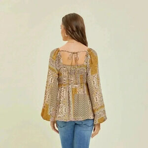 Heyson plus boho style top, sheer fabric, body is lined, smocked stretch back with tie detail, lightweight balloon sleeves, scarf print multi color fabric, outer top is 100% polyester/lining 100% rayon, hand wash/line dry, NWT