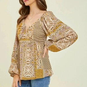 Heyson plus size boho top, split neckline, smocked back, long sleeve, NWT