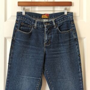 VTG and straight out of the 90s - These amazing boot cut jeans feature a dark indigo wash, high rise, studs along the trim, and lace up details at the cuffs. They have a zipper and button closure, belt loops, and open pockets on the front and back. They have a small brand flag on the front right pocket. Extremely nostalgic and retro Western look! Classic, comfortable, and cute! Flattering, trendy, and high quality!