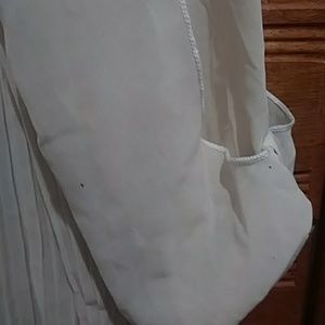 Cream-colored blouse with multicolor design on front and shoulders back pleated back fits loose says 2X but if it's like an extra large and if the chest runs real small more like a large