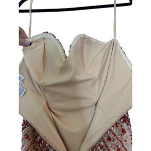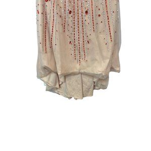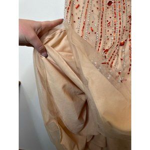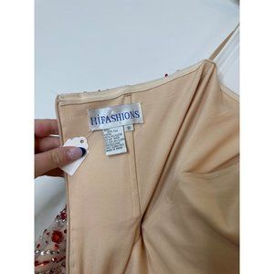 This HiFashions full length sequined dress is in very gently loved, preowned condition with no visible rips or stains. It is tan, white and red in color with sequins that are in good condition, and a small train in the back. This dress is perfect for prom season. Check out my closet for more!