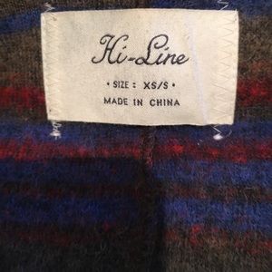 Never worn, two side pockets still stiched closed, Neutral wool colors - camel, blue, red, and brown, open wool sweater jacket. 65% wool, 32% polyester, 3% other fiber exclusive of decoration, size xs/s
