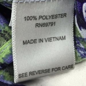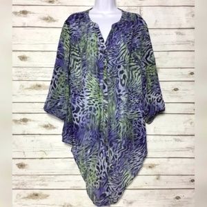 Long top or blouse by Roz & Ali with an abstract animal print and a high-low design. I absolutely love the shades of blue and green in this piece! Has v-neck and brass-like buttons down the front. Sleeves are about 3/4-length with elastic at the cuffs. 100% polyester. Size 2X, measures about 26 inches across from armpit to armpit and 24 inches in length in back and up to 35 inches in front. Sleeves are about 18 inches long. B3
