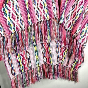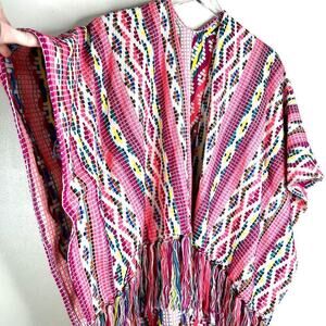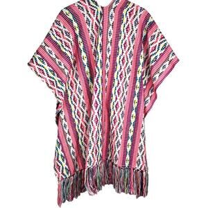 Hi-Lo Poncho Cape Aztec Woven Pattern Fringe Pink Multicolored One Size