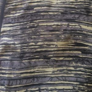 Colors are gray black and white in and at artistic impressionist design. Teardrop loop with fastener on back – black piping down sides- total back length is 37 inches – front is 7 inches shorter