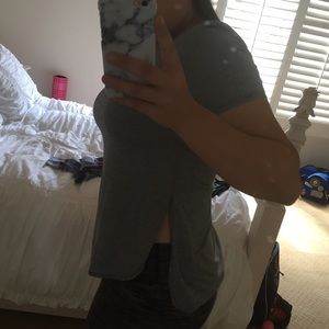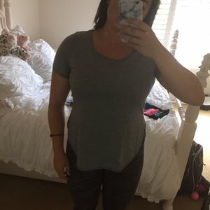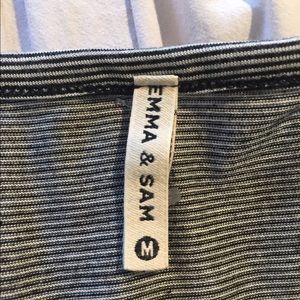 Gray and white, pinstriped, short sleeve, Emma & Sam, tee cut hi-lo with slit at the sides! Super cute and in season!!! From LF!
