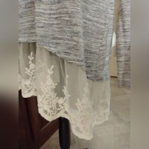 Long sleeve tee with ruffle. Hi-Lo hem. Size L. Gray with beige ruffle. Soft and comfy. Lightweight. Cotton, polyester, spandex.