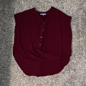 Maroon Hi-Lo Blouse with buttons in front. Sleeveless. Tag says Small but fits bigger, I'd say medium. Gathers at front bottom. Like new. Only wore once.