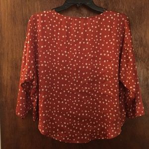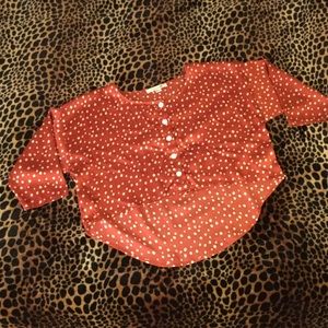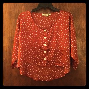 Adorable rust colored hi-low crop top. White polka dots and buttons down the front. 100% polyester but feels like satin! 3/4 sleeves. Front is 16", back is 22". Layer over a ribbed white tank and jeans tucked into your favorite brown boots! Perfect for fall/winter. ๐๐๐