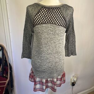 Super cute mixed media lightweight knit high low top. Sheer plaid ruffle, open weave 3/4 sleeves, crocheted panel detailing on shoulders. Makes a cute swim coverup! Gently worn and laundered with some light pilling as shown in last 2 pics. See pics for measurements.