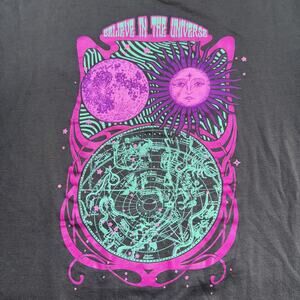 This is a Hi-Res T-Shirt in size XL with a regular fit and short sleeves. It features a graphic print of a universe theme on a gray fabric. The shirt is designed for unisex adults.