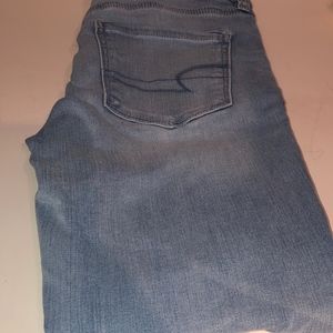 American Eagle hi-rise jegging in a light wash ombre coloring. Ankle length, tight fitted.