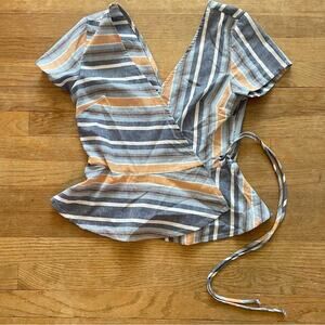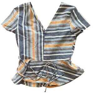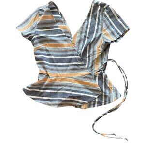 Hiatus Short Sleeve Wrap Tie Stripe Peplum Topsail Canopy V-Neck Top Small S B3