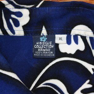 Vintage Mens XL Hawaiian short sleeve button down by Hibiscus Collection. Shirt is made from very thin and lightweight 100% Rayon. The shirt is in good overall condition. There are a few spots of minor wear on the bottom front of the shirt above the hem.