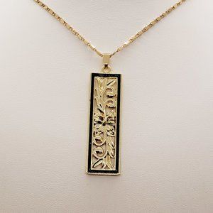 High Quality Gold Plated Hibiscus Fern necklace with black enamel border. The gold plated necklace measures 21 inches with a 3 inch extender attached for your adjustment. You can easily adjust the necklace to your fitting up to 24 inches in length. The Gold chains are solid and sturdy and very durable