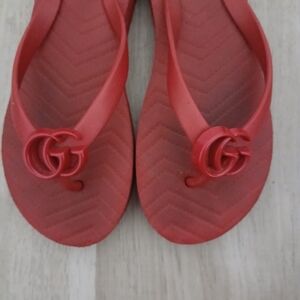 These gorgeous pair of platform GG embellished flip-flops with a chevron design are perfect for any occasion. These can easily be your go-to for any occasion to be dolled up or just wearing them with your casual wear would still look great.😊 Please refer to the pictures to better determine if they meet your expectations. As you can see, they are in excellent preloved condition with lots of life left on them. The platform comfortably gives you that extra height for those who are vertically challenged like myself. Thank you for stopping by to check out my closet.
