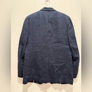 This blue blazer features a classic tailored design with notched lapels, offering a versatile look suitable for both business and smart-casual occasions. Crafted from Italian linen, it provides a slightly textured appearance perfect for spring and summer wear. The structured shoulders add a touch of sophistication to its relaxed fit.