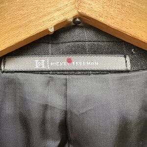 Classic Hickey Freeman Collection men’s blazer tailored with Italian Ing. Loro Piana & C. Tasmanian Super 150’s wool. Dark gray with subtle pinstripes. Fully lined, two-button closure, double vent back, and four-button cuffs. Made in USA. Originally tailored for Darien Sport Shop, Darien CT. Timeless investment piece for business, formal, or special occasions.