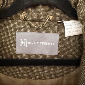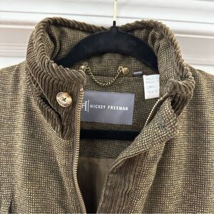 RARE!! Hickey Freeman Wool Corduroy Tweed Zip Up Outdoor Field Barn Vest Brown. Size large. Excellent condition. Corduroy back, collar and zipper trim. Front flap pockets, slit zip pocket and interior pocket. Satin lining.